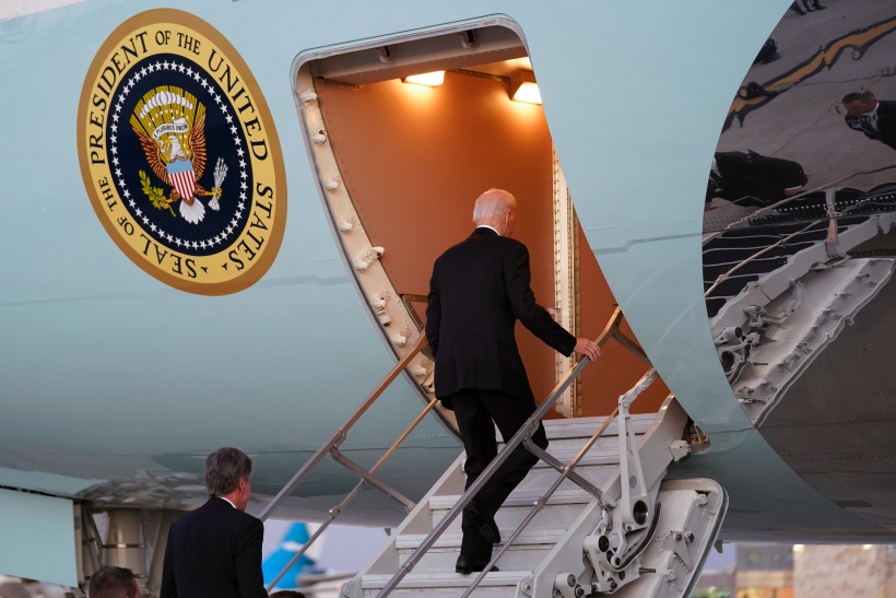 President Joe Biden and U.S. Secretary of State Antony Blinken, below, board Air Force One after meeting Israeli Prime Minister Benjamin Netanyahu, Wednesday, Oct. 18, 2023, in Tel Aviv. Biden and Blinken are traveling back to Washington. (AP Photo/Evan Vucci)