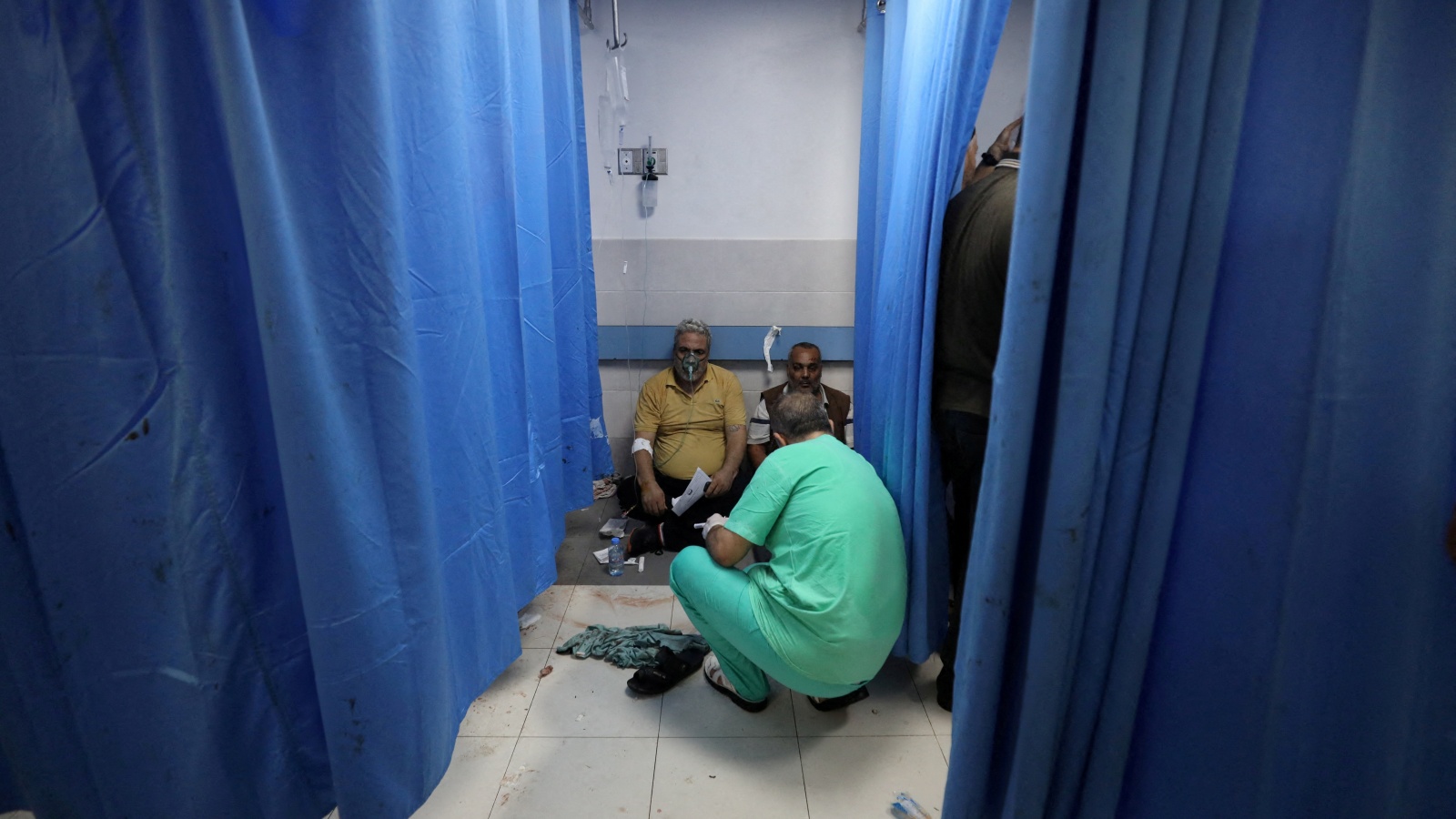 Wounded Palestinians sit in al-Shifa hospital in Gaza City, central Gaza Strip, after arriving from al-Ahli hospital following an explosion there, Tuesday, Oct. 17, 2023. (AP Photo)
