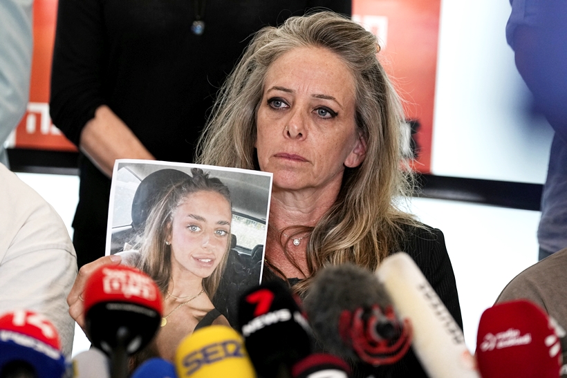 Keren, mother of Mia Schem and representatives of the families of the abducted and missing persons held by Hamas militants in Gaza hold a press conference following the release of a video by Hamas, in which the 21-year-old Israeli woman is seen. (AP)