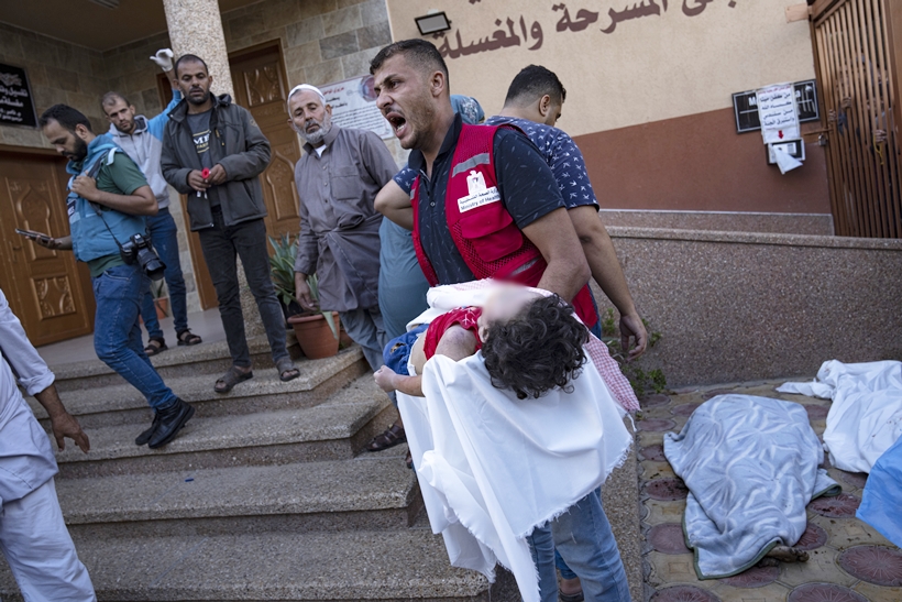 Palestinian medic holds a child killed d in the Israeli bombardment of the Gaza Strip in a morgue in Khan Younis, Oct. 17, 2023. (AP)