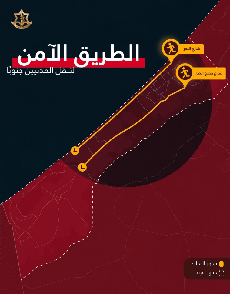 An Israel Defense Forces spokesperson said that the military will allow the safe movement of Gazans moving south on two main roads between 10 am and 4 pm today.