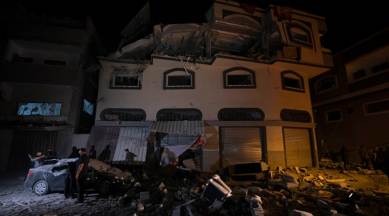 The airstrike damaged the half of the second and most of the third floors of a house in the Shejaeya neighborhood east of the city.
