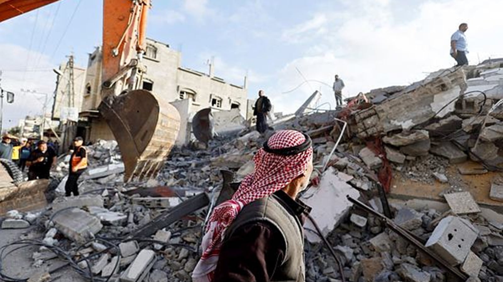 A passerby looks on as Palestinians inspect the site of an Israeli strike on a house, in Rafah, in the southern Gaza Strip. (Reuters photo)