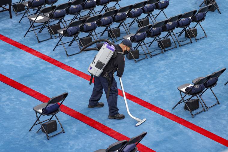 A worker vacuums as preparations are made ahead of President-elect Joe Biden's inauguration ceremony, Wednesday, Jan. 20, 2021, in Washington. (Tasos Katopodis/Pool Photo via AP)