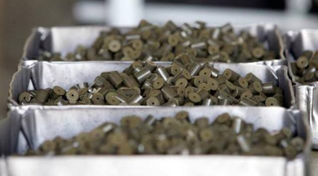 Uranium pellets, a nuclear fuel product for atomic power plants, are seen on a production line at Ulba Metallurgical Plant in Kazakhstan. (Source: Reuters)