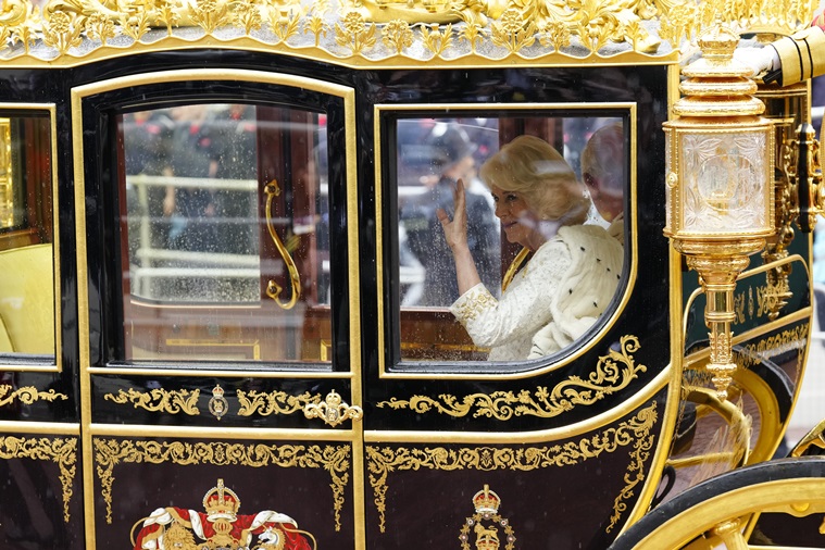 The royal couple travelled at a stately pace in the Diamond Jubilee State Coach bearing a gilded crown, which was commissioned for Queen Elizabeth II in 2012, the report said.