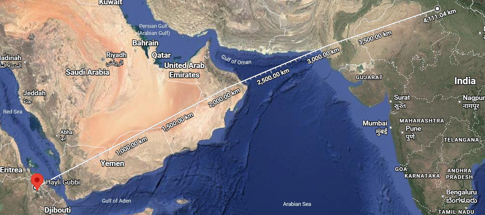 The Hayli Gubbi volcano, which erupted on Sunday, spewed ashes up to 14 km high. The volcano is located about 800 kilometres northeast of Addis Ababa. It erupted for several hours on Sunday. The nearby village of Afdera was completely covered in ash. It has now travelled to India's New Delhi, travelling over 4,000 km.
