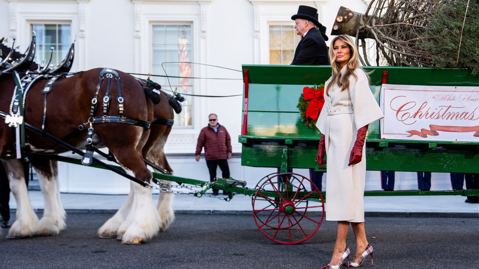 First lady Melania Trump on Monday welcomed this year’s official White House Christmas tree, a white fir from a farm in Michigan that arrived by horse-drawn carriage.