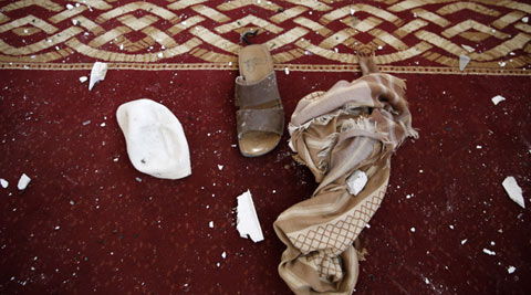 Clothes of a victim lie on the ground of a Shiite mosque hit by two bombs in Sanaa, Yemen, Thursday, Sept. 3, 2015. An Islamic State-claimed suicide bomber and a subsequent car bombing killed at least 20 people Wednesday at a mosque in Yemen’s rebel-held capital, Sanaa, amid the country’s raging civil war, officials said. (AP Photo/Hani Mohammed)