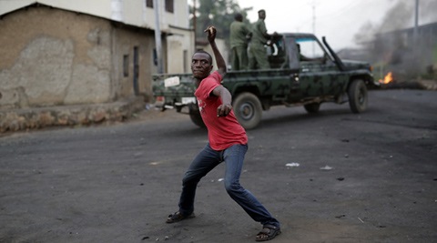 A demonstrator throws a stone at Burundi riot police as a Burundi military truck drives by in Bujumbura, Burundi, Wednesday April 29, 2015. Protesters were again on the streets Wednesday, angry over the Burundian president’s third term bid that they say is unconstitutional as a top U.S. diplomat headed to the East African nation. (AP Photo/Jerome Delay)