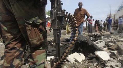 Somali government soldiers stand at the scene of a suicide bomb attack outside the United Nations compound in the capital Mogadishu.(Source : Reuters)