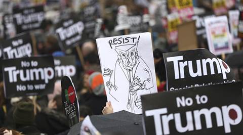 Protesters held black banners with blood stains bearing slogans such as “No to Trump. No to War” and “Trump: Special Relationship? Just say no.” at the demonstration against the ban and Trump’s foreign policy.