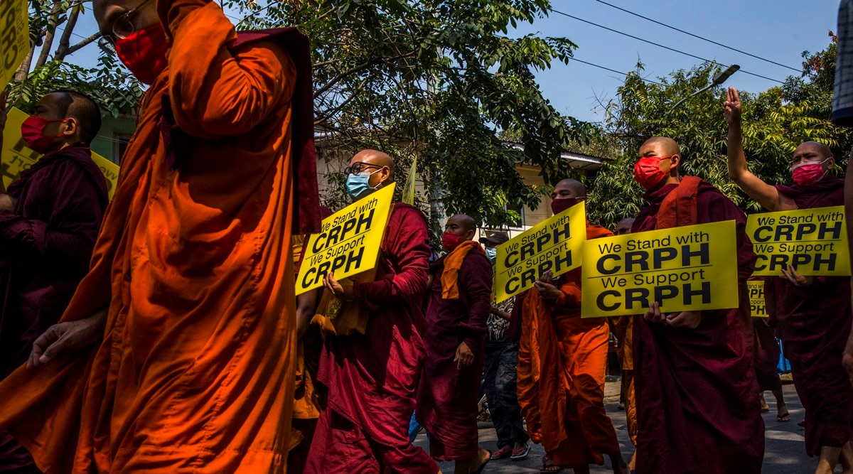 Monks protest the army coup of Myanmar in Mandalay on Feb. 27, 2021. (The New York Times)
