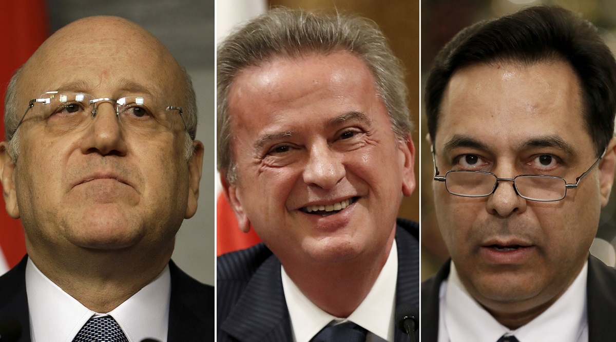File images of Lebanese Prime Minister Najib Makati (left), Lebanon central bank’s governor Riad Salameh (centre) and former Lebanese Prime Minister Hassan Diab (right). (AP)