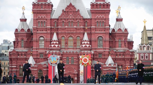 A stage has been set up on the Moscow square with giant video screens and billboards proclaiming the four areas part of Russia.