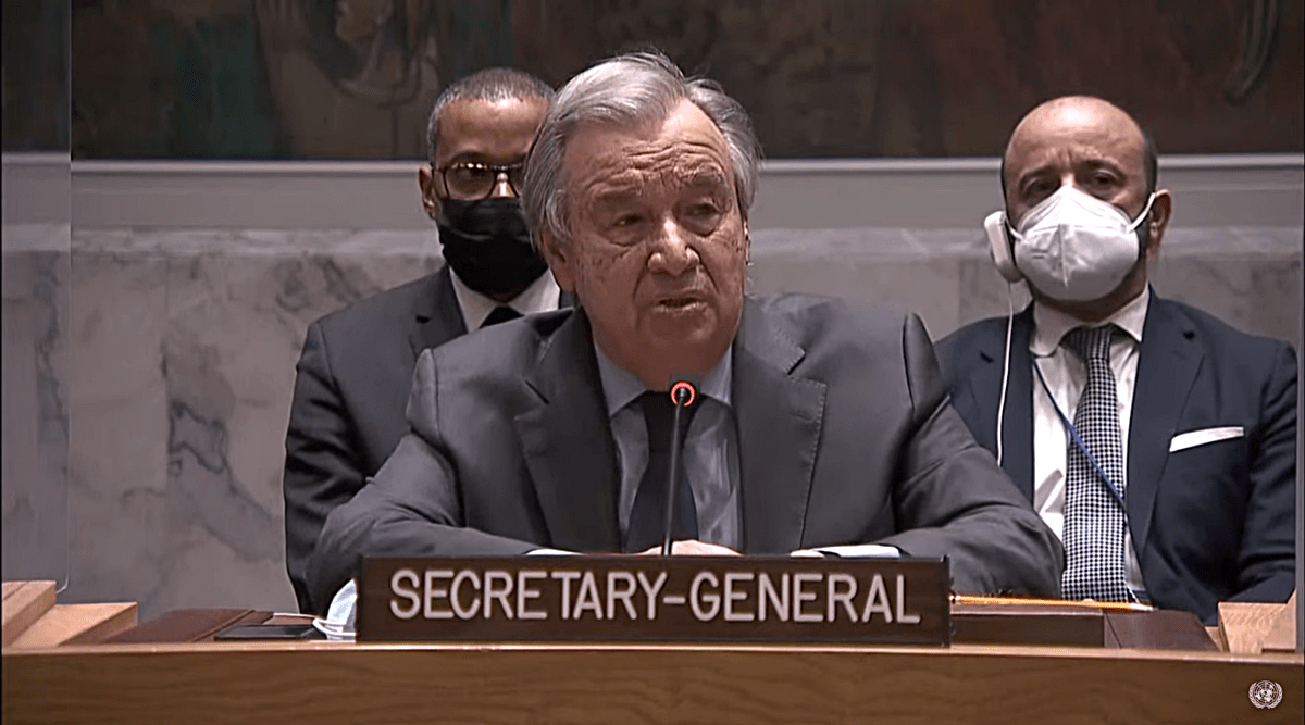 UN Secretary-General Antonio Guterres at the emergency meet of UNSC on Ukraine. (Screenshot)