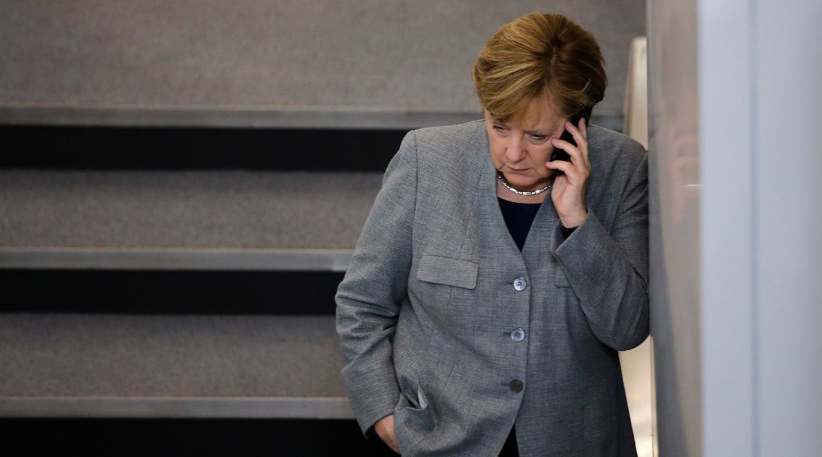 In this Oct. 24, 2017 file photo German Chancellor Angela Merkel phones during a break of a meeting of the German parliament in Berlin, Germany. (AP) Russian pranksters posing as Ukraine’s ex-President Petro Poroshenko managed to contact Angela Merkel by phone to discuss developments in Ukraine and Belarus, although the former German chancellor appeared wary during the call.