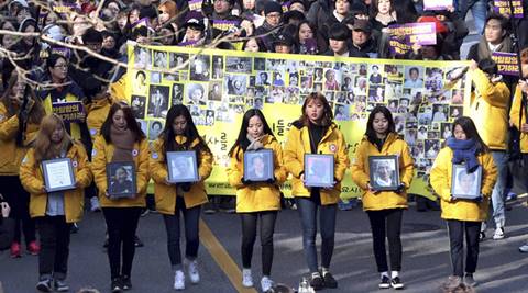 Seoul: South Korean college students march with portraits of deceased former South Korean sex slaves who were forced to serve for the Japanese military in World War II, during a rally against Japanese government in Seoul, South Korea, Wednesday, Dec. 28, 2016. AP/PTI