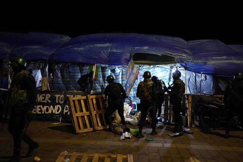 As daylight broke, dozens of troops in riot gear marched through the area and rows of protest tents that stood on both sides of the main road that passes in front of the president's secretariat completely cleared out. (Reuters)