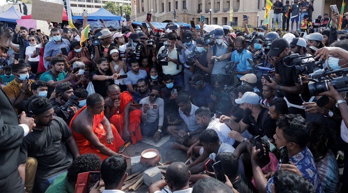 Sri Lankan demonstrators on Thursday celebrated the Sinhalese and Tamil new year at the protest site opposite President Gotabaya Rajapaksa’s office, where they have been camping for six days demanding his resignation. Volunteers distributed traditional New Year delicacies like squares of kiribath or coconut milk rice, bananas, spicy pickles, and butter cake, that were donated by supporters, according to Reuters.