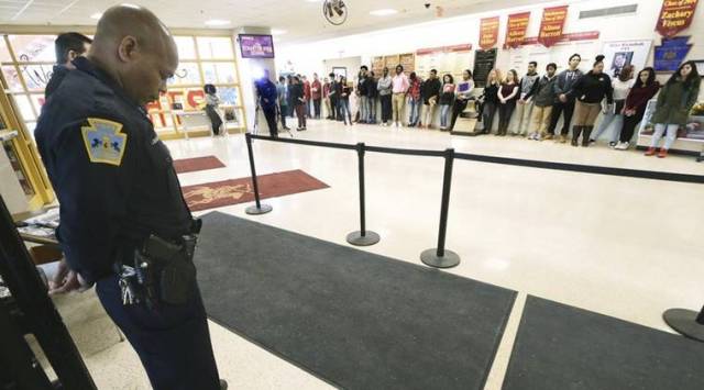 In this March 14, 2018, file photo, police patrolman John Burgette, 53, a school resource officer for 18 years, bows his head as Scranton High School students stand in silence to protest gun violence for 17 minutes at the high school in Scranton, Pa. (Butch Comegys/The Times-Tribune via AP)