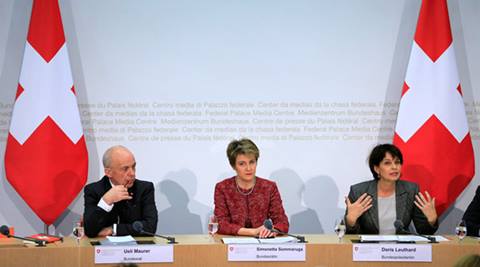 (L to R) Swiss Finance Minister Ueli Maurer, Swiss Justice Minister Simonetta Sommaruga and Swiss President Doris Leuthard attend a news conference after the vote on the Corporate Tax Reform Act III in Bern, Switzerland February 12, 2017. (Source: REUTERS/Pierre Albouy)