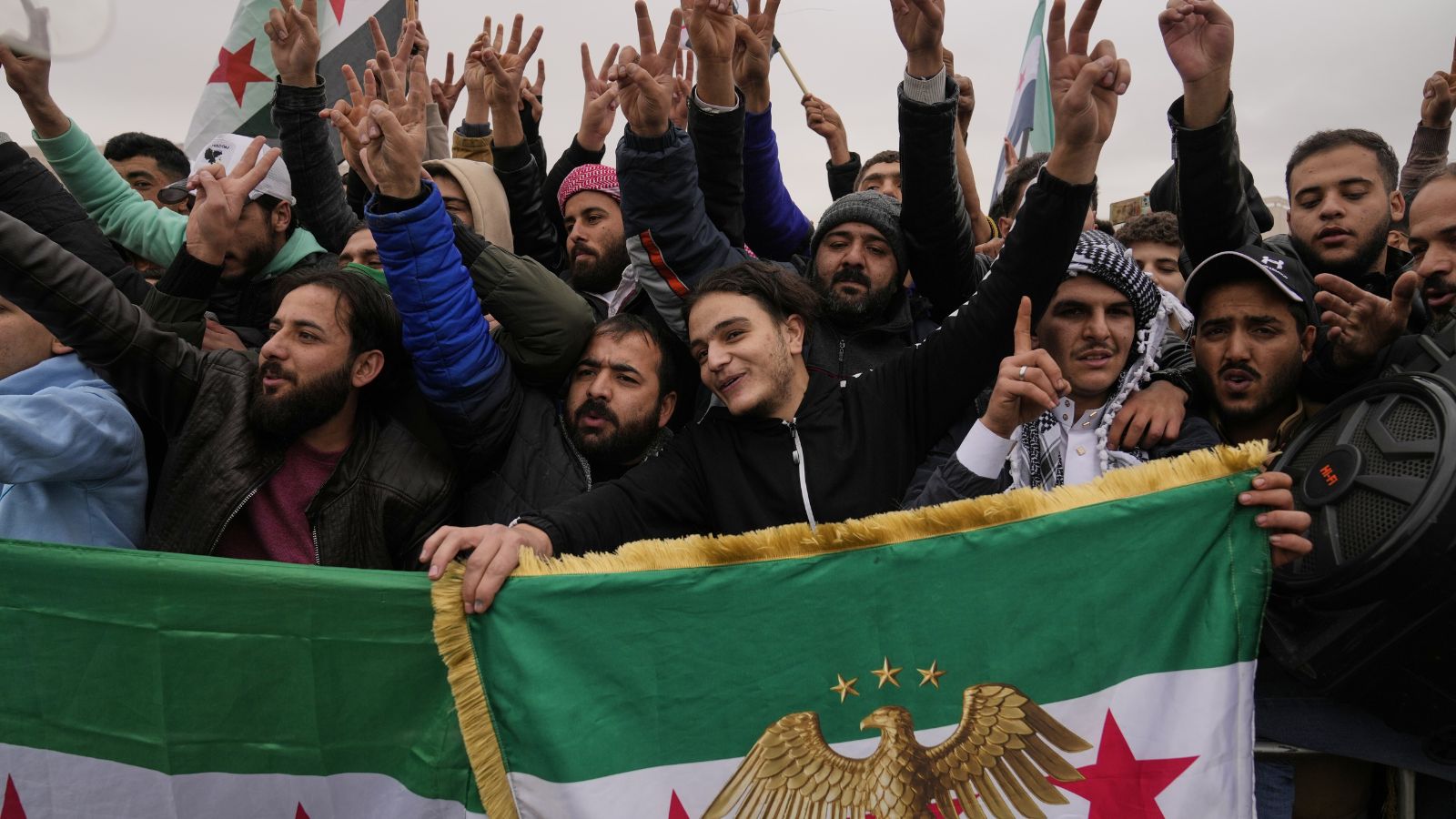 People celebrate and wave Syrian flags as they wait for a parade by the new Syrian army during celebrations marking the first anniversary of the ousting of former President Bashar Assad in Damascus, Syria, Monday, Dec. 8, 2025. (AP Photo/Hussein Malla) Syrians marked the first anniversary of the overthrow of Bashar al-Assad and his iron-fisted rule on Monday, as the fractured nation struggles to find stability and recover after years of war.