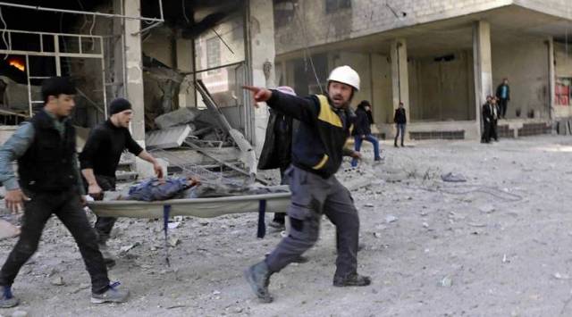 Ghouta: This photo released Tuesday Feb. 20, 2018, provided by the Syrian Civil Defense group known as the White Helmets, shows members of the Syrian Civil Defense group carrying a man who was wounded during airstrikes and shelling by Syrian government forces, in Ghouta, a suburb of Damascus, Syria. (AP)