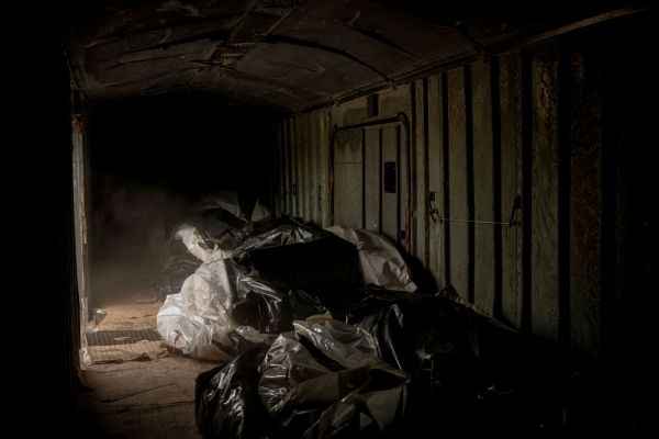 They lie in white and black bags at 20 degrees below zero Celsius, but the stench is still overpowering. Filled with the bodies of 62 Russian soldiers, the bags are stacked in a refrigerated train car in a secret location on the outskirts of Ukraine’s second-largest city. A spry, elderly train worker spun open the vaultlike door to reveal the bloodied bags as the scent hung in the damp air.
