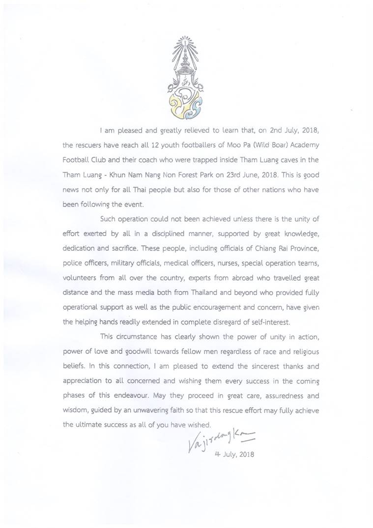 On 4 July 2018, Prime Minister General Prayut Chan-o-cha, has disclosed that His Majesty the King has issued a message of appreciation, commendation, and encouragement to the Thai and foreign teams who have worked tirelessly together to locate and rescue the Moo Pa (Wild Boar) Academy Football Club trapped inside the Tham Luang caves in Tham Luang-Khun Nam Nang Non Forest Park, Chiang Rai Province since 23 June 2018. Further to this, His Majesty the King has graciously bestowed His well wishes for the successful outcome of all operations concerned with this mission.
