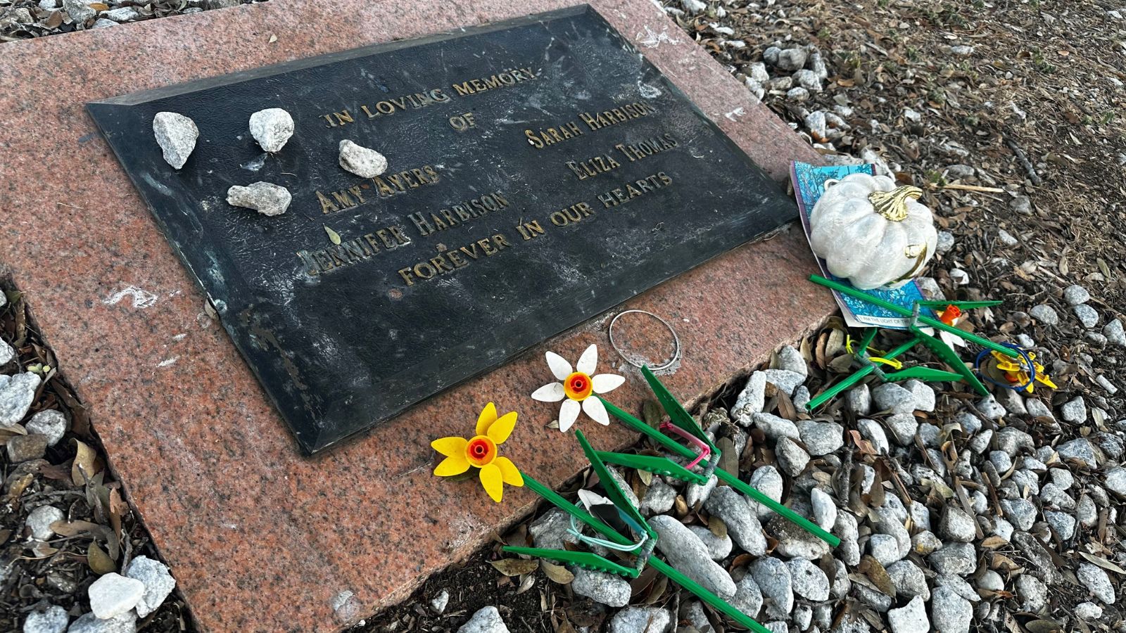 Tributes lay on a memorial Friday, Sept. 26, 2025, for four teenage girls who were killed in a yogurt shop in 1991 in Austin, Texas. (AP Photo/Paul J. Weber)
