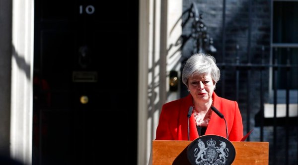 British Prime Minister Theresa May reacts as she makes a speech in the street outside 10 Downing Street in London, England, Friday, May 24, 2019. Theresa May says she’ll quit as UK Conservative leader on June 7, sparking contest for Britain’s next prime minister. (AP Photo/Alastair Grant)