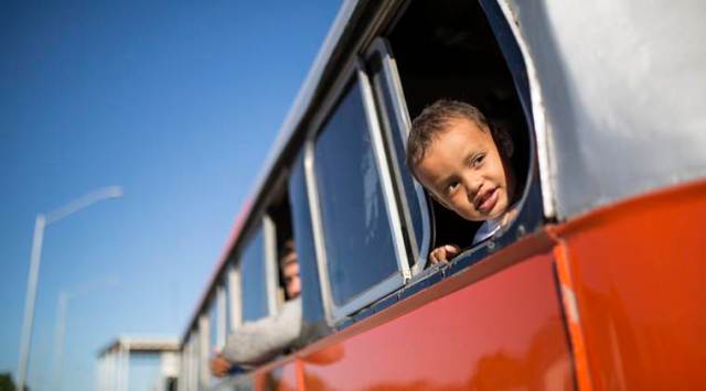 One-year-old Richard Mejia, who is part of the Central American caravan hoping to reach the US border, pokes his head out a bus window, in La Concha, Mexico. (AP Photo/Rodrigo Abd)