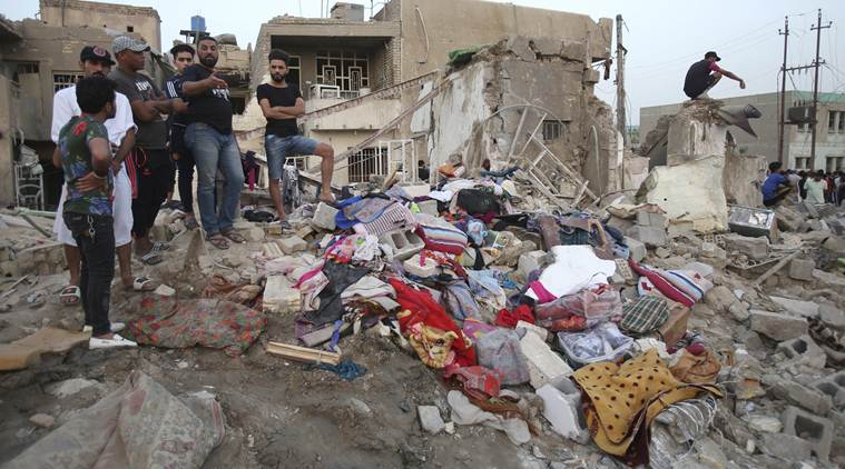 People stand at the site after blasts in Baghdad’s Sadr City, Iraq, Thursday, June 7, 2018. A pair of explosions ripped through a mosque in a mostly Shiite district of Iraq’s capital Wednesday, security officials said. (AP Photo/Karim Kadim)