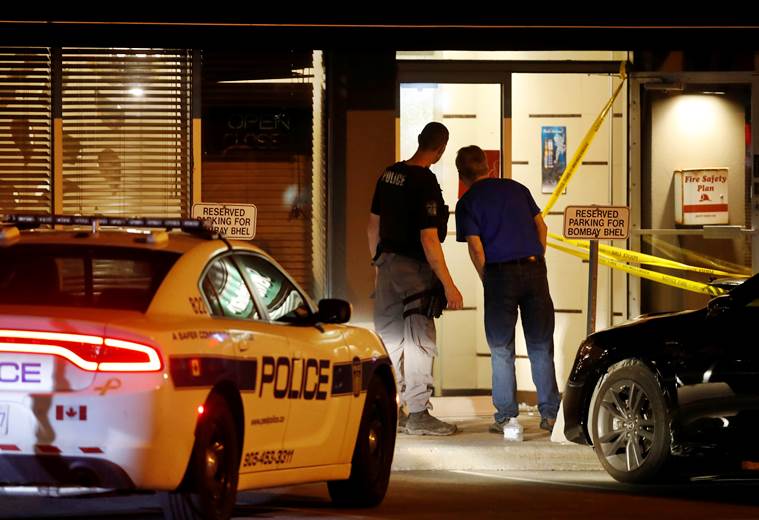 Police officers stand in front of Bombay Bhel restaurant, where two unidentified men set off a bomb late Thursday night, wounding more than a dozen people, in Mississauga, Ontario, Canada May 25, 2018. REUTERS/Mark Blinch