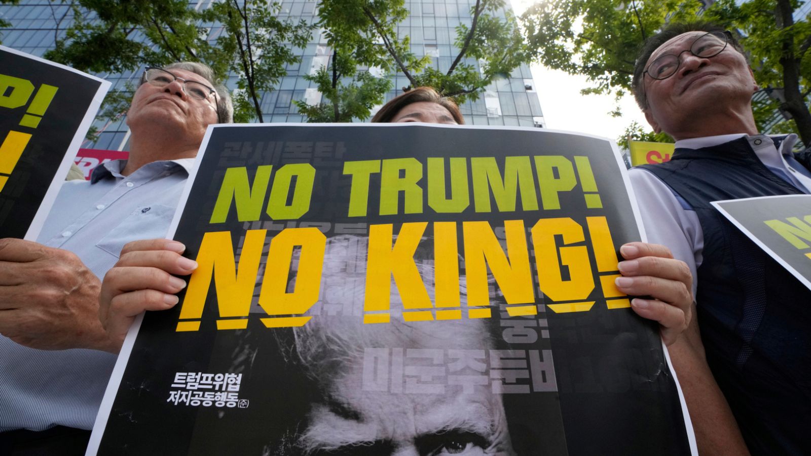 South Korean protesters attend a press conference against U.S. President Donald Trump's tariffs policy on South Korea, near the US Embassy in Seoul, South Korea. (AP Photo)