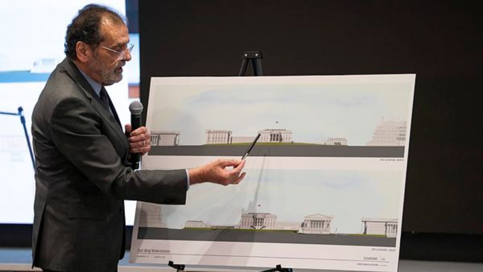Architect Shalom Baranes points at a rendering on a board during a National Capitol Planning Commission meeting discussing the White House ballroom project, Thursday, Jan. 8, 2026, in Washington. (AP Photo) US President Donald Trump’s team has presented plans for a new $400 million ballroom at the White House, telling a federal planning body that they are also considering adding an extra storey to part of the West Wing.