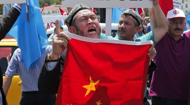 In this file photo, Uighurs living in Turkey and Turkish supporters, chant slogans as they hold a Chinese flag before burning it during a protest near China’s consulate in Istanbul. (AP)
