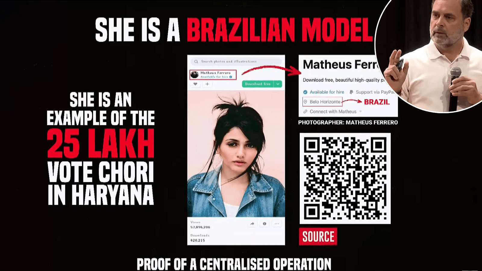 Rahul Gandhi shows Larissa Nerry's photo, which was allegedly used in Haryana voter lists.