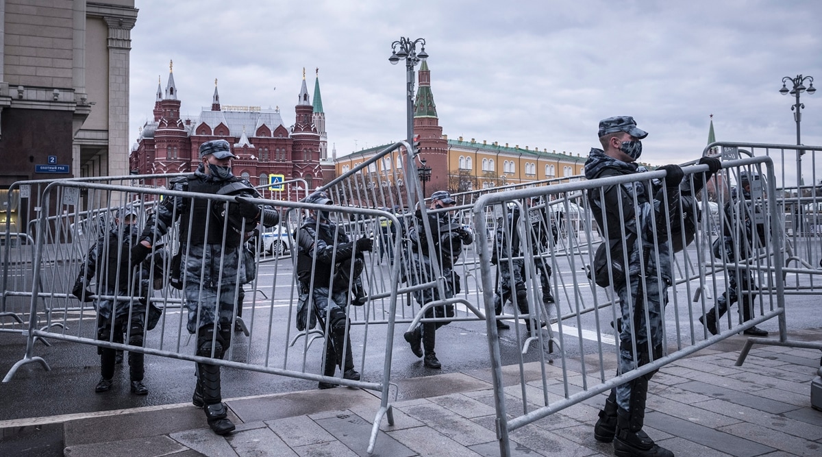 Riot police seal off streets ahead of protests in support of Alexei Navalni in Moscow on April 21, 2021. (Sergey Ponomarev/The New York Times)