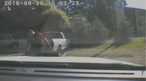 A dashboard camera from a police car showed Keith Scott, killed on Tuesday, exiting his car and backing away from it. Police shout to him to drop the gun, but it is not clear that he has anything in his hand. Then shots break out and Scott drops to the ground.