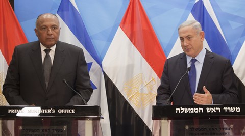 Israeli Prime Minister Benjamin Netanyahu and Egyptian foreign minister Sameh Shoukry, left, attend a press conference in Jerusalem(AP Photo/Dan Balilty)