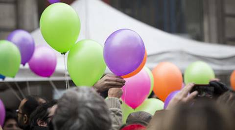 People prepare to release balloons at Paris 11th district town hall during a ceremony for the victims of last year’s Paris attacks which targeted the Bataclan concert hall as well as a series of bars and killed 130 people. (AP Photo)
