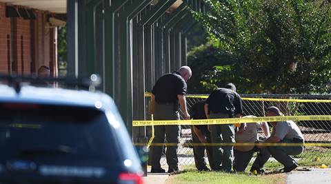 Members of law enforcement investigate an area at Townville Elementary School on Wednesday, Sept. 28, 2016, in Townville, S.C. A teenager opened fire at the South Carolina elementary school Wednesday, wounding two students and a teacher before the suspect was taken into custody, authorities said. (AP Photo/Rainier Ehrhardt)