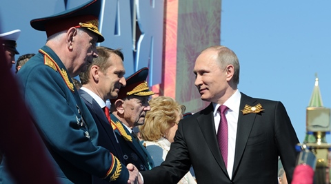 Russian President Vladimir Putin greets WWII veterans during the Victory Day military parade marking 71 years after the victory in WWII in Red Square in Moscow, Russia, Monday, May 9, 2016. (AP photo)