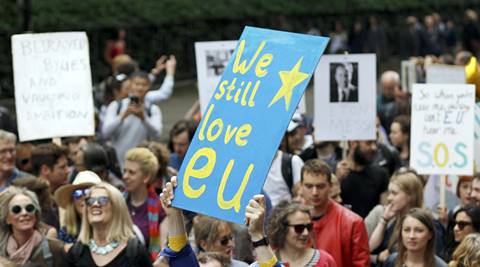 People hold banners during a ‘March for Europe’ demonstration against Britain’s decision to leave the European Union, in central London, Britain July 2, 2016. Britain voted to leave the European Union in the EU Brexit referendum. (Source: Reuters)
