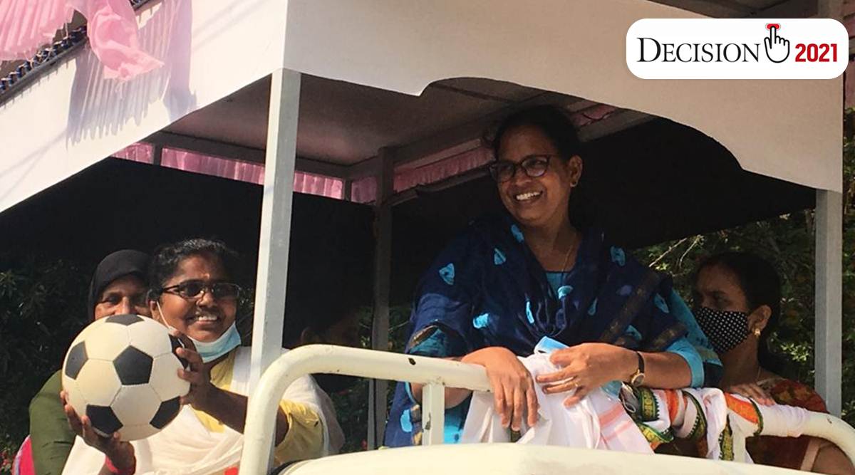 From the distance it looks like a cross. But it’s just a long pole with a crossbar, on both sides of which hang two small, white frocks with marks that look like blood stains. Accompanying it are half-a-dozen people who make up the campaign team of the woman who has been dubbed the ‘Walayar mother’, and who is contesting as a candidate from Dharmadam, the CPM fortress from where Chief Minister Pinarayi Vijayan is standing for re-election.