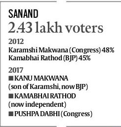 In Sanand constituency, the choice of the Koli Patel community is considered decisive — it forms around one-sixth of the electorate, and has a reputation of voting in a block. In 2012, Congress’s Karamshi Makwana, a Koli Patel leader, narrowly defeated the BJP’s Kshatriya candidate, Kama Rathod.