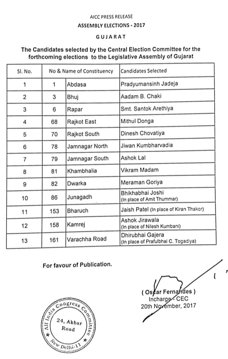 Here is the second list of 13 candidates for the Gujarat Election 2017: