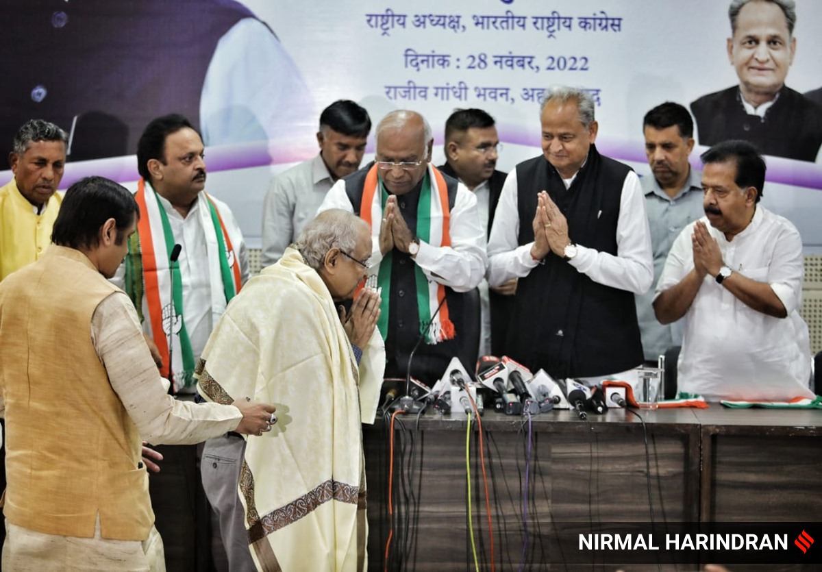 Former BJP leader Jay Narayan Vyas joins Congress in presence of party president Mallikarjun Kharge and Rajasthan CM Ashok Gehlot at GPCC office. (Express photo by Nirmal Harindran)Days ahead of the first phase of the Gujarat Assembly elections on December 1, former minister and veteran BJP leader Jay Narayan Vyas along with son Sameer Vyas joined the Congress on Monday, in the presence of Congress president Mallikarjun Kharge and Rajasthan Chief Minister Ashok Gehlot at Rajiv Gandhi Bhavan in Ahmedabad.